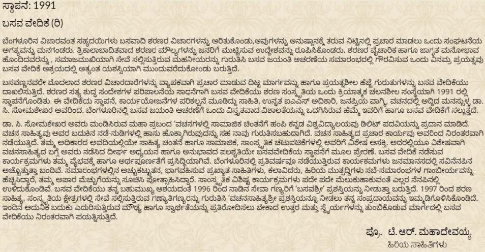 ಬೆಂಗಳೂರಿನ ವಿಚಾರವಂತ ಸಹೃದಯಿಗಳು ಬಸವಾದಿ ಶರಣರ ವಿಚಾರಗಳನ್ನು ಅರಿತುಕೊಂಡು,ಅವುಗಳನ್ನು ಅನುಷ್ಠಾನಕ್ಕೆ ತರುವ ನಿಟ್ಟಿನಲ್ಲಿ ಪ್ರಚಾರ ಮಾಡಲು ಒಂದು ಸಂಘಟನೆಯ ಅಗತ್ಯವನ್ನು ಮನಗಂಡರು. ತ್ರಿಕಾಲಾಬಾದಿತವಾದ ಶರಣರ ಮೌಲ್ಯಗಳನ್ನು ಜನರಿಗೆ ಮುಟ್ಟಿಸುವ ಉದ್ದೇಶವನ್ನು ರೂಪಿಸಿಕೊಂಡರು. ಶರಣರ ವೈಚಾರಿಕ ಹಾಗೂ ಜಾಗೃತ ಮನೋಭಾವ ಹೊಂದಿದವರನ್ನು , ಸಮಾಜಮುಖಿಯಾಗಿ ಸೇವೆ ಸಲ್ಲಿಸುತ್ತಿರುವ ಮಹನೀಯರನ್ನು ಗುರುತಿಸಿ ಬಸವ ಜಯಂತಿ ಅಚರಣೆಯ ಸಮಾರಂಭದಲ್ಲಿ ಗೌರವಿಸುವ ಒಂದು ವಿನಮ್ರ ಪ್ರಯತ್ನವು ಬಸವ ವೇದಿಕೆ ಅಶ್ರಯದಲ್ಲಿ ಅತ್ಯಂತ ಯಶಸ್ವಿಯಾಗಿ ಮುಂದುವರೆದುಕೋಂಡು ಬರುತ್ತಿದೆ.